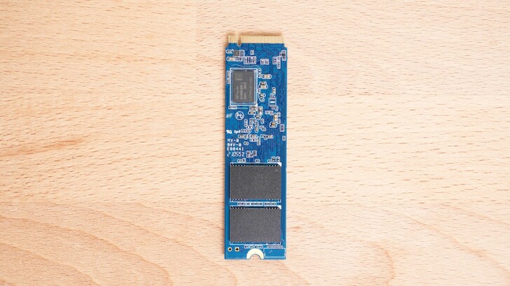 正背面各有一顆 1G 的 RAM,而記憶體顆粒正反面總共有四顆 512GB 顆粒,加起來一共有 2TB 儲存空間。整體含散熱片厚度為 3.7mm,基本上常規的筆電應該都裝得下。