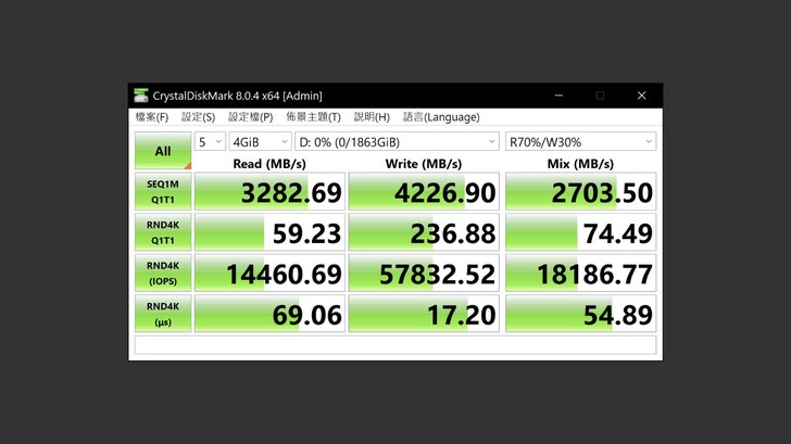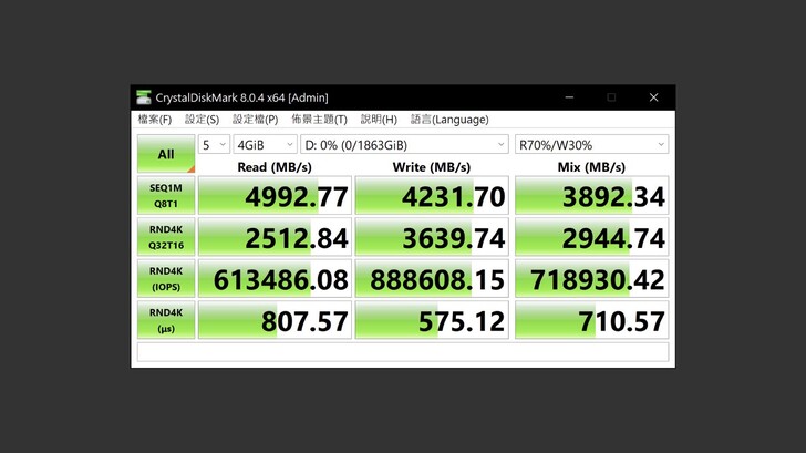 用 CrystalDiskMark 實測讀寫速度,設定為 NVMe SSD-最佳效能-Read&Write&Mix(30/70)- 5x4GiB。實測讀取速度 4,992MB/s,寫入 4,231MB/s,表現相當優秀。