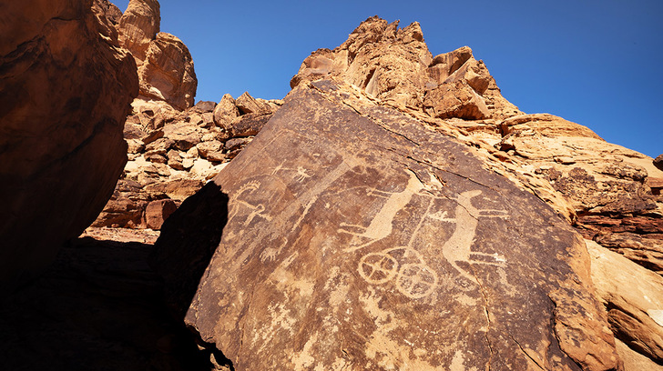 ▲朱拜岩石雕刻,紀錄七千年前古人生活。沙烏地阿拉伯旅遊局/提供