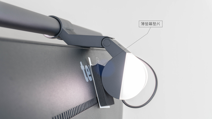有沒有注意到我在上一張圖的時候有個東西沒提到?對就是右上角那塊黑色的東西。坊間的螢幕在厚度上皆有所不同,並沒有一個統一的標準。為了讓所有螢幕皆可以使用這款 ScreenBar Halo,BenQ 很貼心的在配件中附了薄螢幕墊片,這樣就不用擔心你的螢幕會不會無法架穩 ScreenBar Halo 啦!