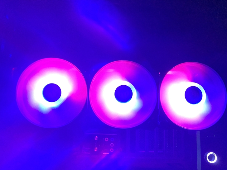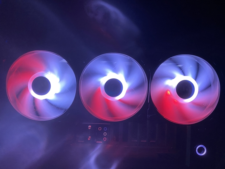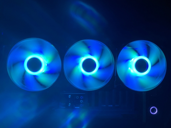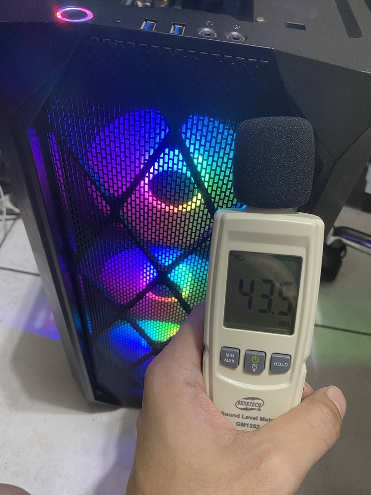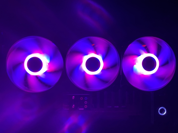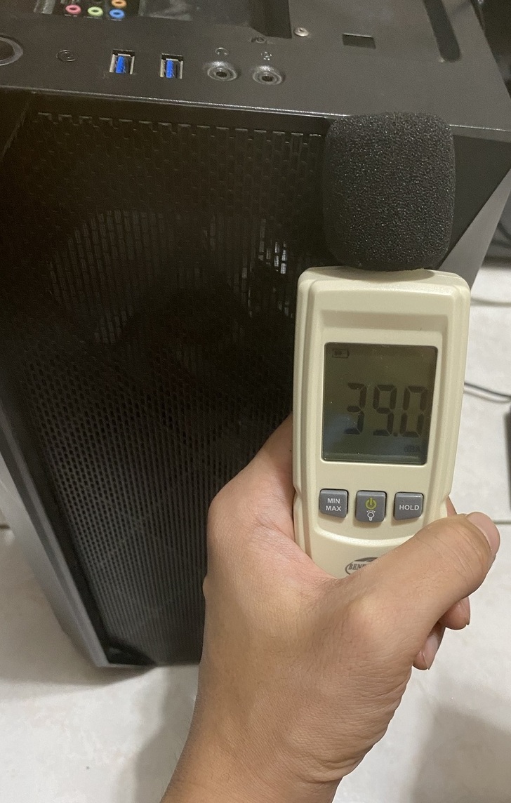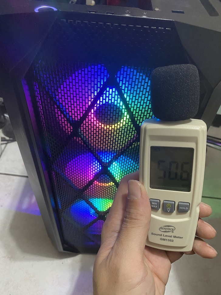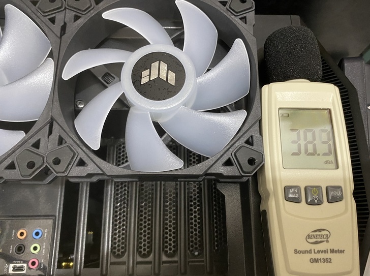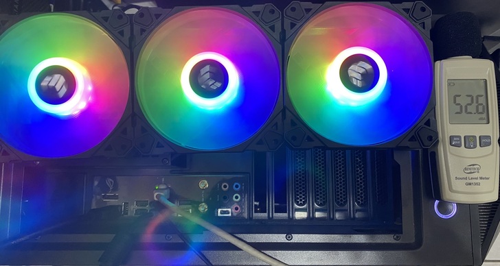 散熱效能上,裝上本體三組風扇後在全速運轉上能產生蠻大的風量,量化成溫度能讓系統內部降下4-5度。而透過強化的抗震襯墊,可透過抑制嘎噠聲和振動來降低風扇噪音,且經分貝計測試在開起最高轉速(1900RPM)後,測試數據約在50分貝,主機在一般使用時所產生的噪音量尚可接受。
