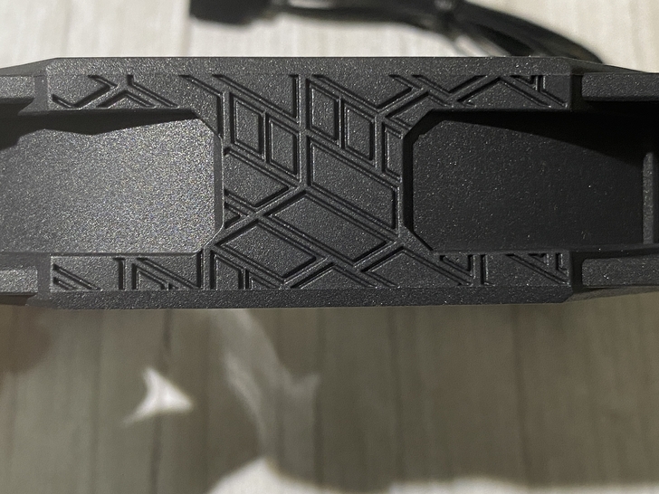 ▼風扇本體 : 扇葉中心為TUF LOGO浮雕設計, 在LOGO周圍包覆著黑底斑紋,帶點軍用色彩的巧思點綴。