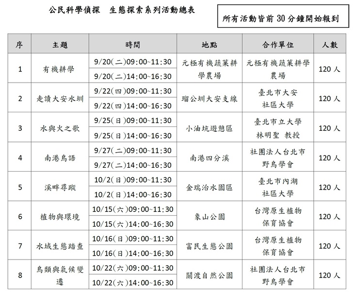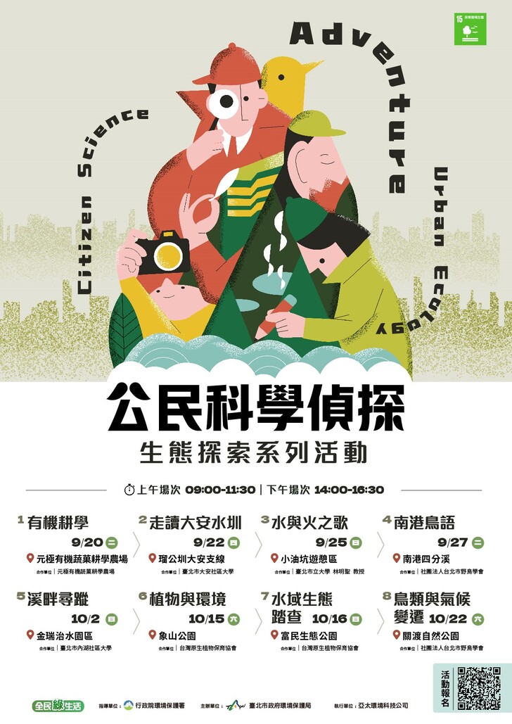 「公民科學偵探」生態探索系列活動自9月20日至10月22日止,共8個主題,每個主題上下午各一場次,每場名額有限。民眾可上「臺北市無圍牆環境教育博物館網站」(https://eemuseum.gov.taipei/)查詢與報名;如有相關問題,可電洽02-2218-9099分機205張小姐、02-2720-8889分機7232彭先生詢問。