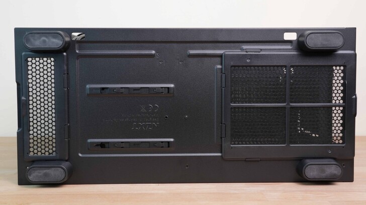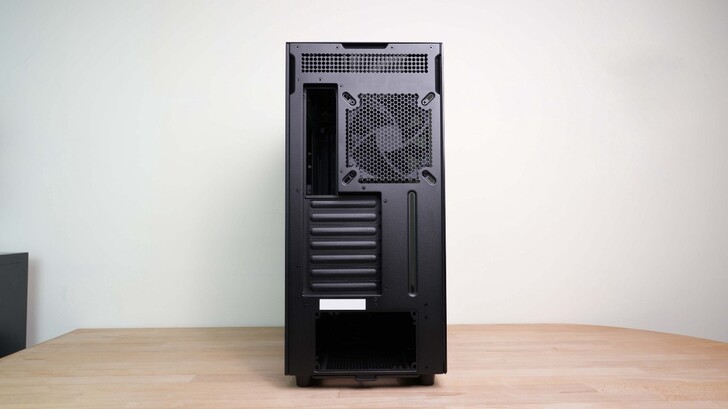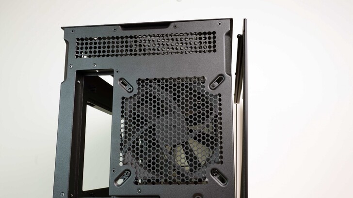 背面可以看到機殼本身採用常規的下置電源設計,機殼的最上方有一排進出風孔,如果你在頂部安裝風扇或是水冷的話,可能有些風扇有設計過可以從側面輔助進風或出風的,就不用擔心風沒地方去。