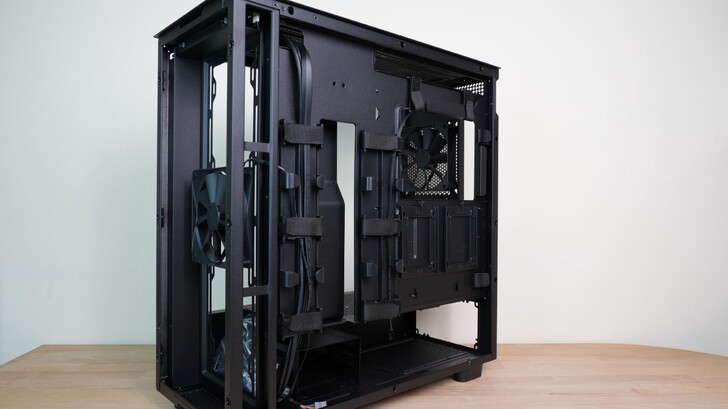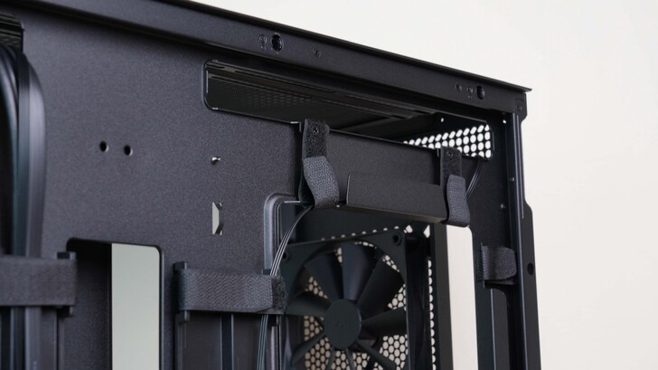 背部的理線設計做得非常充足,如果你不是非常追求每一條線都要排的整整齊齊,或是一定要怎麼樣,其實剛剛配件和的束線帶應該是用不太到的。機殼本身預裝好的魔鬼沾就非常夠用了。