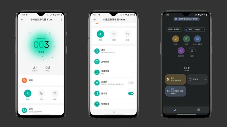 小米家電的一大優勢就是在於它的生態系,能夠透過網路串連整個居家的裝置,且不限於小米自家的生態系,Google Home 等生態系也能夠無縫接軌。而小米淨化器 4 Lite 在這方面毫無縮減,甚至是加以善用這優勢。前面提到了 4 Lite 沒有了觸碰螢幕,因此它的操作大部分都是透過 App 來操作。App 除了可調整風速、模式、定時啟動外,還可顯示濾心的剩餘壽命。雖說機身上可操作的按鈕不多,但搭配 App 與生態系後,在功能上卻是比競品好上不少的。