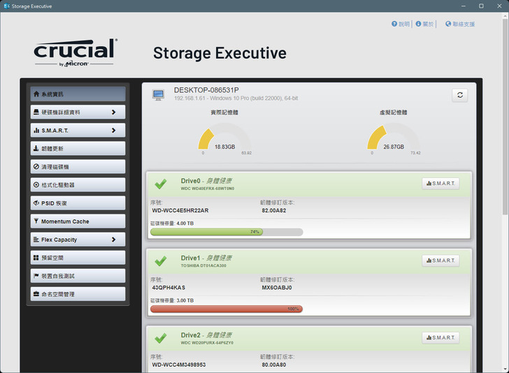 一開始進來的頁面,可以監控每個磁碟機的運作情形與剩餘容量