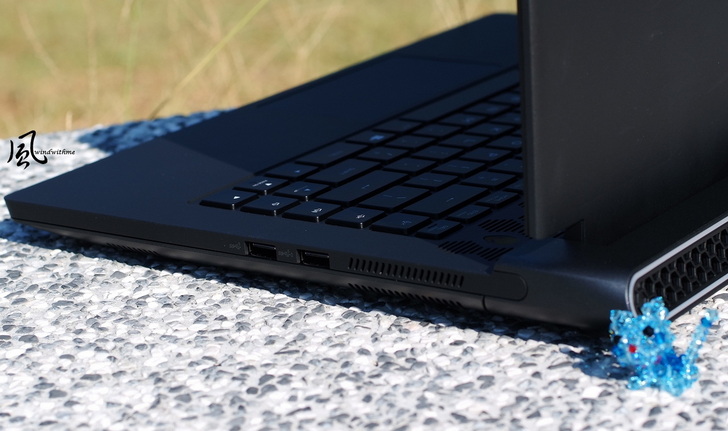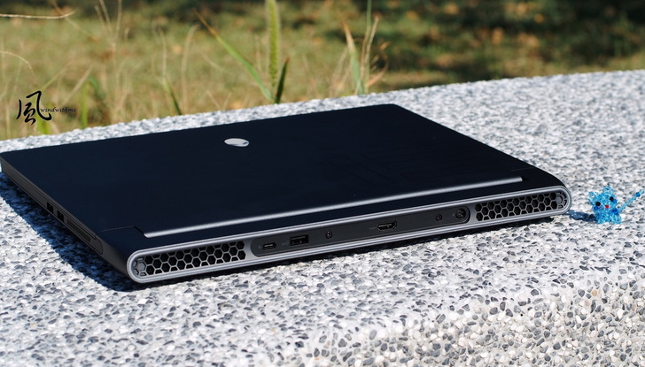 左右兩旁為蜂巢式散熱器孔,IO左起依序為Type-C(包含USB 3.2 Gen2、DisplayPort 1.4、5V/3A電源供應等功能)、Type-A USB 3.2 Gen1、HDMI 2.1(支援HDCP 2.3)、電源DC輸入。