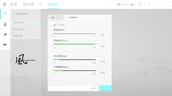 提供筆電產品中非常少見的超頻功能,有兩種超頻設定可供使用者直接套用,兩種Dell已經調好的超頻參數,可隨時看到CPU、GPU當下詳細狀況,進階檢視頁面有散熱限制、核心時脈、記憶體時脈選項。
