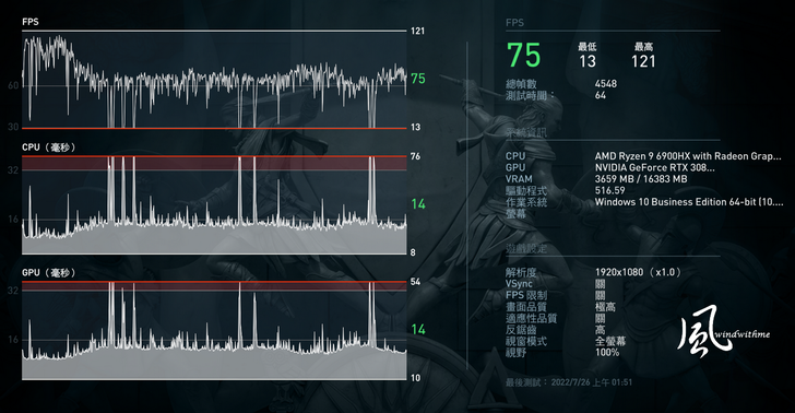 畫質預設極高,內建測速,1080P解析度=>75FPS、最低13、最高121;