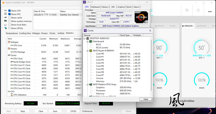 AIDA64 Stress CPU、FPU全速時由Alienware Command Center測出約90度,以往測過許多搭載高階CPU筆電,長時間燒機往往時脈會掉到2.8~3.2G左右,Alienware m15 R7 AMD在長時間燒機多數時間都保持在4G實屬難能可貴。