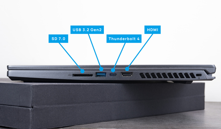 右側有著標準尺寸 SD 7.0 卡槽、USB 3.2 Gen2 Type-A、Thunderbolt 4 以及 HDMI,還不錯,該有的都有。