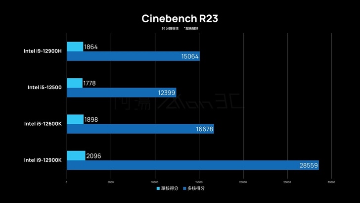 至於實際上的表現我們直接看跑分。CineBench R23,用於測試 CPU 理論性能,結果如圖。理論性能大約介於桌機版的 i5-12500 與 i5-12600K 之間。