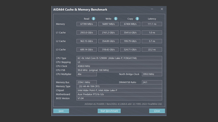 接下來看到 AIDA64 的快取與記憶體測試,採用了 LPDDR5-4800 記憶體,讀取部分來到了 67,789MB/s,但延遲則來到了 111.1ns。