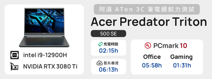 ACER Predator Triton 500 SE 值不值得購買?我覺得值得購買,但僅限於搭載 RTX 3070 且售價低於 8 萬的版本上。因為這台筆電的問題不是規格不好,而是規格太好,以致於機器的散熱系統無法有效應對。而 Intel 第 12 代的行動版 CPU i9-12900H 則是展現了其優秀的彈性,以高效能核心 P-core 搭配高效率核心 E-core,不管在省電上還是性能上都有著很好的表現。相較於 Intel 第 11 代處理器,變革挺大的,因此我會建議近期如果要買筆電,優先選擇 CPU 型號是 12 開頭的筆電,例如:i7-1260P、i9-12900H、i5-1235U 等。
