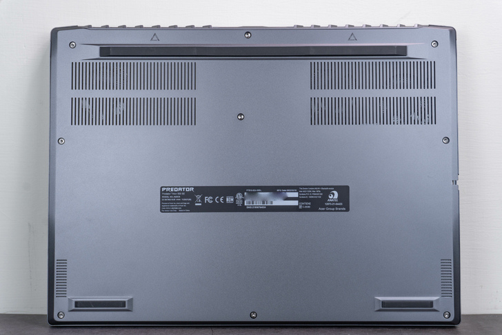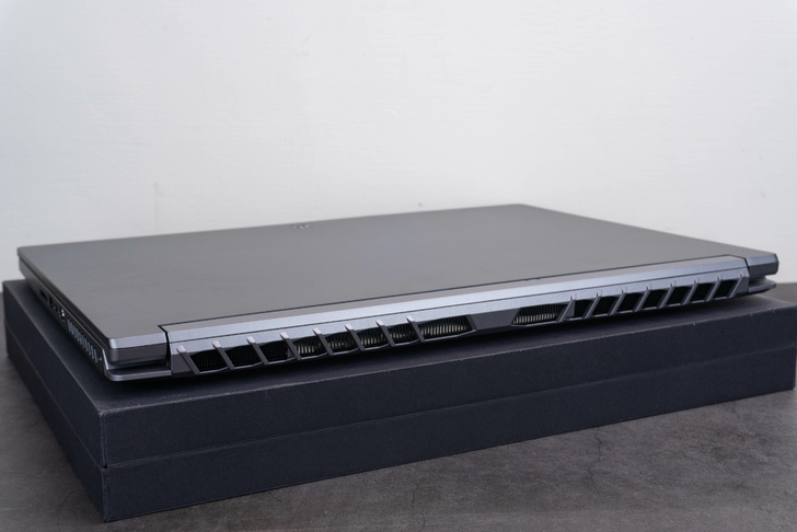 背面同樣乾淨俐落,有著對稱的散熱開孔以及墊高筆電的黑色膠條。
