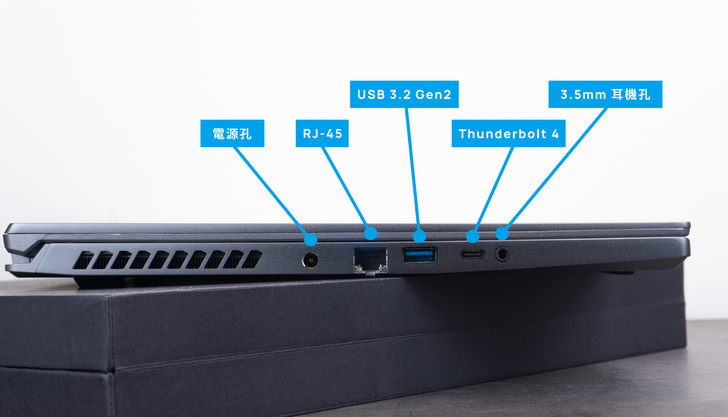 左側有著電源孔、RJ-45 網路孔、USB 3.2 Gen2 Type-A、Thunderbolt 4 以及 3.5mm 耳機孔。