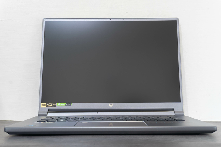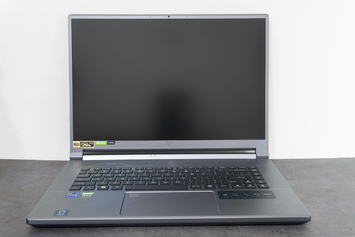 打開螢幕後,可見到同樣簡潔的螢幕與鍵盤面。螢幕邊框相當窄,搭載的是一塊 16 吋 2K 16:10 解析度的霧面電競螢幕,有著 240Hz 的高更新率。