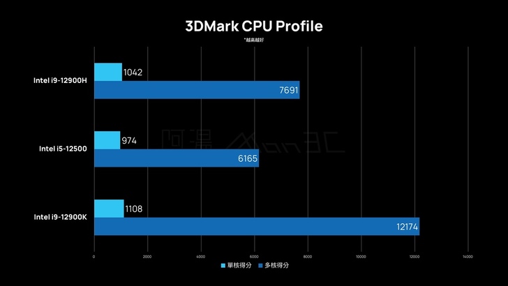 3DMark CPU Profile 也是類似的結果,不過有一個比較有趣的點在於。就算在散熱、功耗有限制的筆電上,i9-12900H 的單核性能依舊可以與桌機老大哥 i9-12900K 匹敵。多核心性能則受限於筆電散熱模具的物理限制。