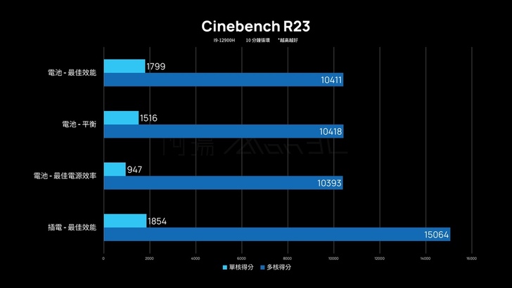 同樣先看到 Cinebench R23,分別以 Windows 11 三個電源模式 最佳電源效率 / 平衡 / 最佳效能做測試,可以發現多核心的表現竟然差不多,都在一萬分左右,僅在單核心性能部分有出現差異。