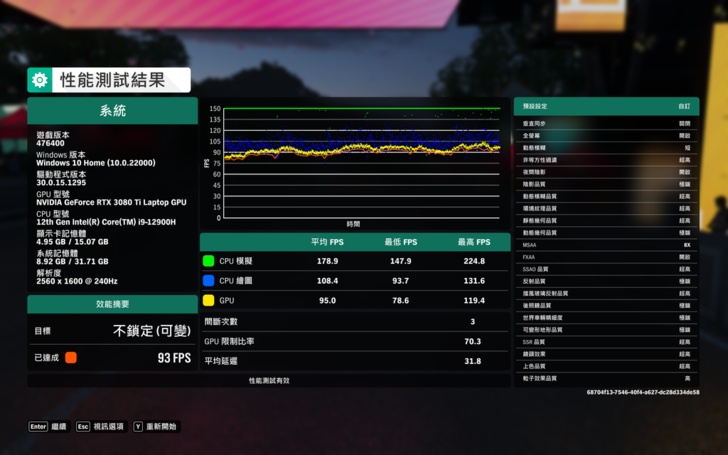 那麼看一下其他遊戲的表現,Forza Horizon 4,平均幀 93。可以發現 i9-12900H 表現其實相當不錯,CPU 模擬部分獲得了 178.9 幀的平均幀,CPU 繪圖也有著平均 108.4 FPS,反倒是 GPU 平均幀僅有 95。