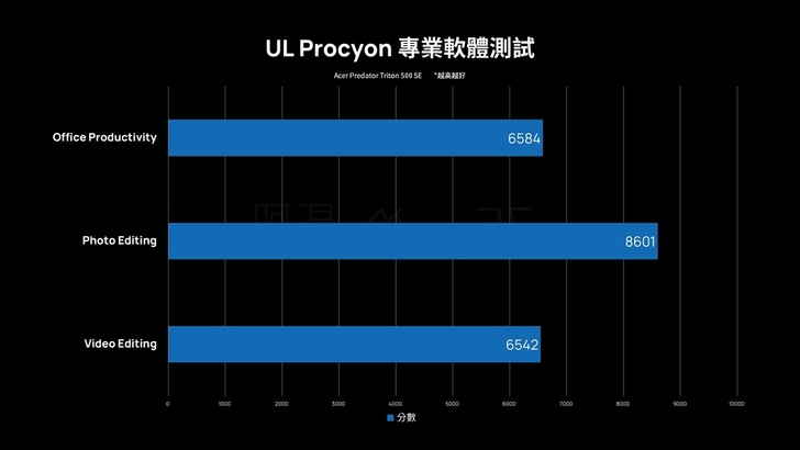 至於專業軟體的表現,首先看到 UL Procyon 專業生產力測試,在 Office、影像編輯與影片剪輯部分,分數分別達到了 6584 分、8601 分與 6542 分。CrossMark,總分 1951 分。PCMark 10,測試機器整體的辦公軟體性能表現,得分 6919 分。