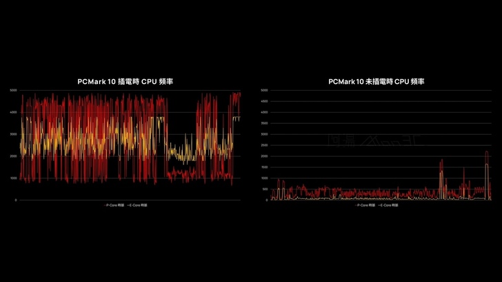 透過 PCMark 紀錄測試時曲線,可以發現電源模式的選擇對於頻率影響較大。