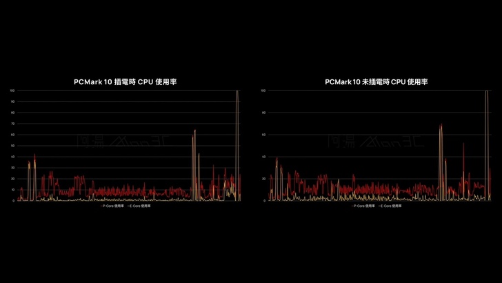 不過呀,這畢竟是筆電有插電時的測試結果,如果是用筆電的電池呢?在未插電的情況下,我們會期待筆電能夠拿出最佳的電源效率,在維持性能不錯的情況下盡量減少功率消耗。