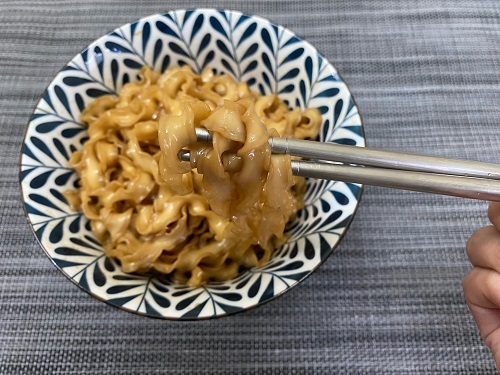 大家看看這個麵條,有點刀削捲邊的,超級有彈性、咬掉會彈牙那種~~