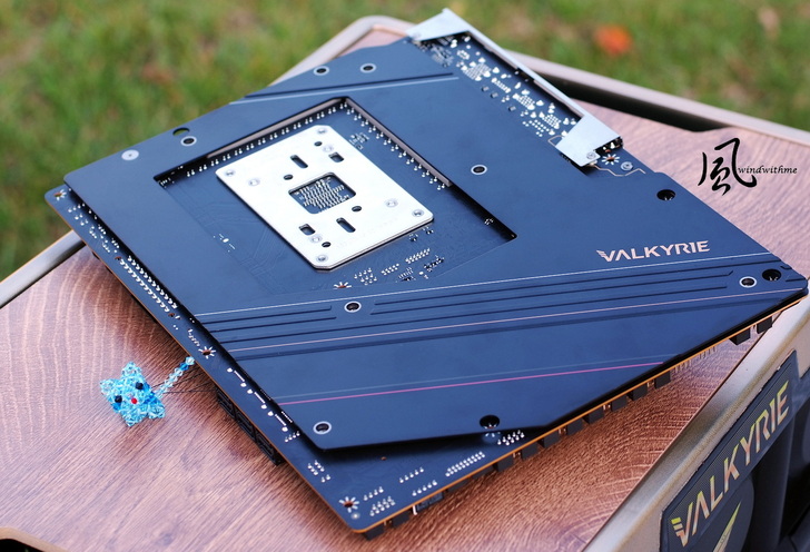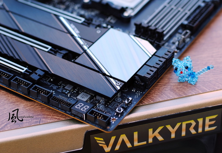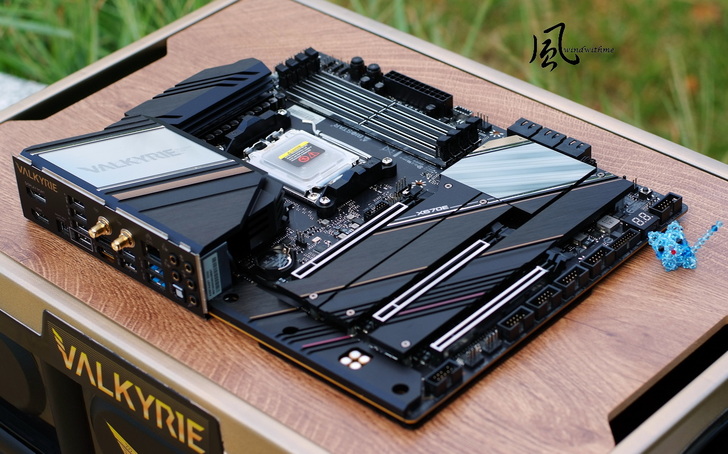 8層板PCB並採用ATX規格,尺寸為305 x 244mm,主機板燈號主要為左上與右下兩個區域,外觀設計以黑色為主體,搭配少數淡金色與粉紅色線條,VALKYRIE系列採用大範圍散熱裝甲,金屬表面髮絲紋路處理也讓質感有所提升。