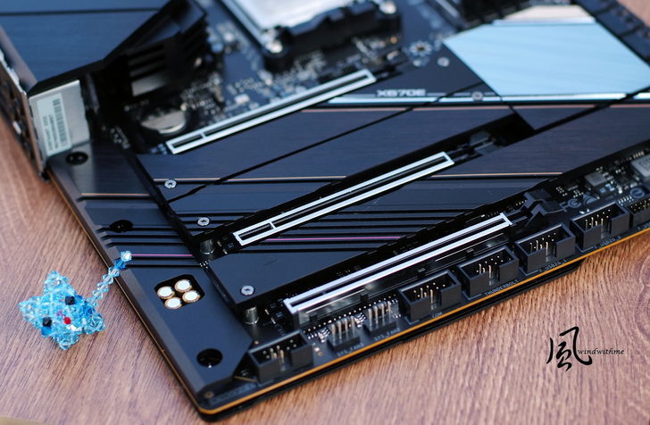 左上為8+8PIN電源輸入,左方IO配置Armor Gear藉以提升質感、保護與加強散熱等等作用,與右下晶片組上方散熱片銀色區域相同,皆採用ARGB設計,此處銀色區域顯示VALKYRIE字樣。