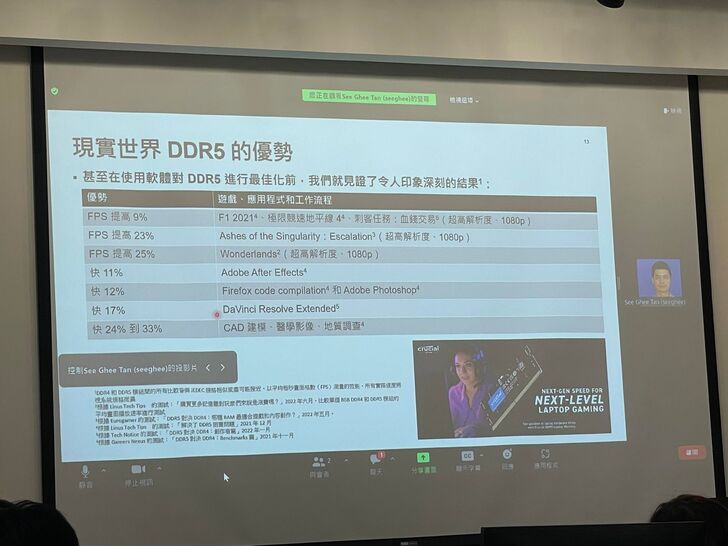 好拉不廢話了,下⾯馬上進入正題。美光很⼤⽅的提供了我們⼀臺配置不錯的電腦,配置部分需要的可以樓下圖片參考,先稍微科普⼀下電腦的組成部分其中兩個為RAM與硬碟,其中RAM(Random Access Memory)⼜名隨機動態存取記憶體(下簡稱記憶體)功能為將使⽤者欲執⾏程式暫時存於其中,提供快於直接⾃硬碟調⽤資料的效能,其標準經過歷年迭代發展⾄今到達了DDR5的階段,每段升級都伴隨著讀取頻率的⼤幅增加,美光這款最新的RAM就⽀援了相當⾼的4800原⽣頻率(JEDEC),能有效省去⽤⼾為達標稱頻率在記憶體超頻時引發的各式問題,這邊提⼀下關於ddr5與4之間的差異,⼯作電壓從ddr4的1.2V降低⾄1.1V即可運⾏,這也意味著使⽤ddr5會更加省電,伴隨著⼯作電壓的降低⽽來的是另⼀個新的改動,由於上述原因,原先設置於主板上的記憶體電源管理IC等將作為其中⼀個亮點成為ddr5的特⾊集成於記憶體電路板上⽅,以便提供更精準、細微的控制,另外crucial ddr5記憶體還提供了對於Intel XMP3.0的⽀援,使⽤者只需啟⽤記憶體的JEDEC設定檔即可將ddr5記憶體被CPU內存控制器沒收的頻率收回(非超頻)⼤家最關⼼的遊戲效能部分,雖說眾所週知的是ddr5記憶體因為時序等因素⽬前延遲會稍遜於ddr4⾼頻記憶體,但美光的這項產品在尚未優化前即可於非FPS遊戲內取得相較JEDEC接近排序之ddr4記憶體9-25%fps領先(1080p),⽣產⼒⽤途更是於Adobe、CAD建模等專業軟體內獲取最多33%的效能進步,實際上機測試,美光ddr5-4800提供的效能完全⾜夠應付任何場景⽽不會成為使⽤瓶頸。