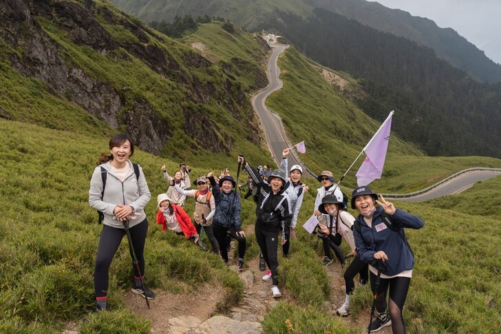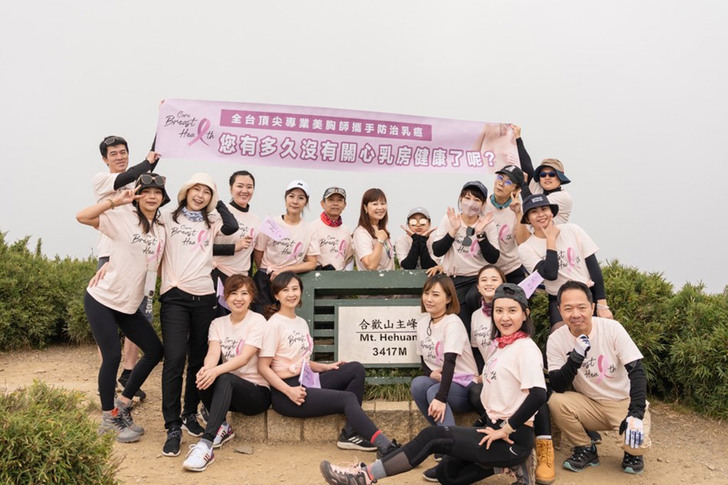 在壯闊的雲海中留下大合照,這一群陽光有活力的女性其實是一群來自北中南各地的專業美胸師與講師,登上合歡山並不是他們的主要目的,而是要透過登山活動宣導女性乳房健康的重要,也響應每年10月的「世界乳癌防治月」。