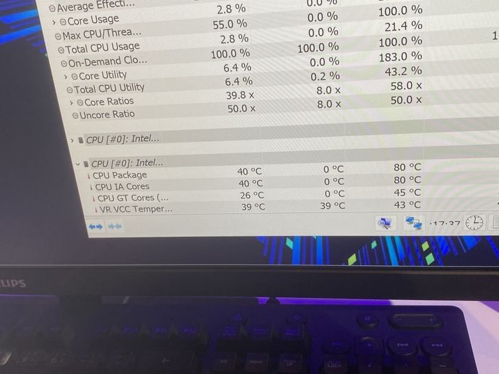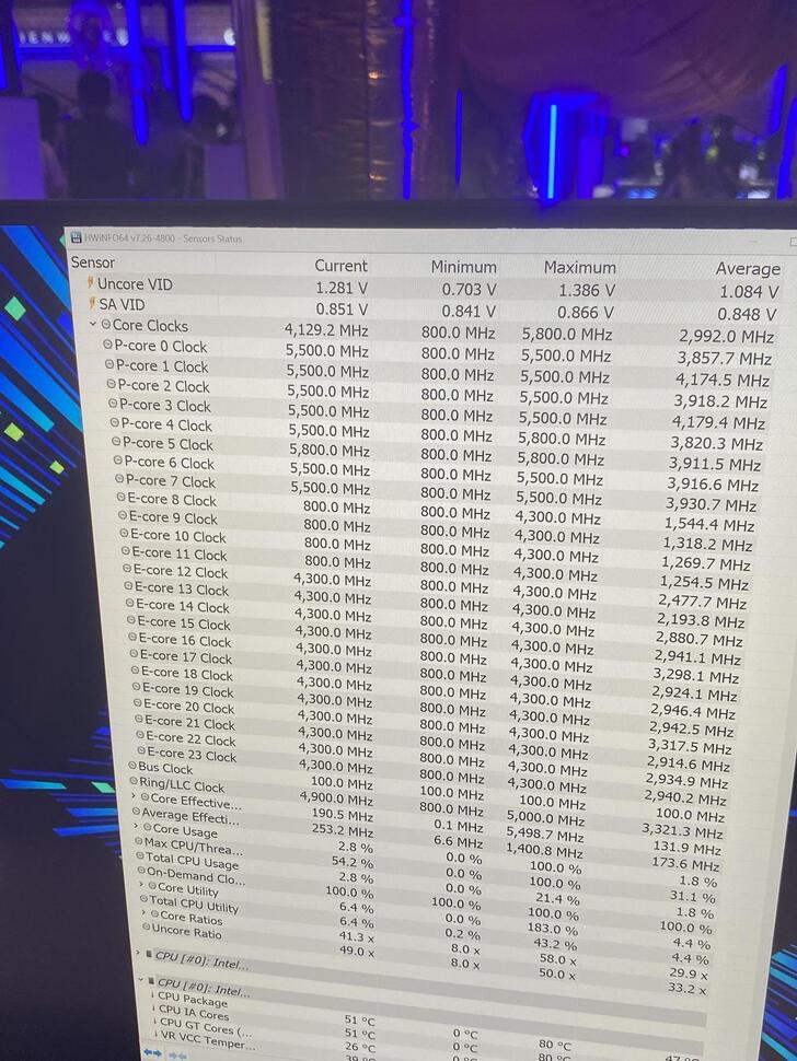 ▼圖表中可直觀顯示出13代Intel Core 24個核心運作時的執行狀況與實時溫度。
