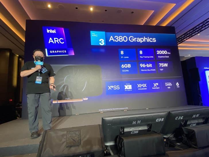 Intel Arc A380是面向大眾的中端款產品,其規格為8個Xe core、核心頻率2450Mhz、6GB GDDR6記憶體,以及記憶體頻寬為186 GB/s等。