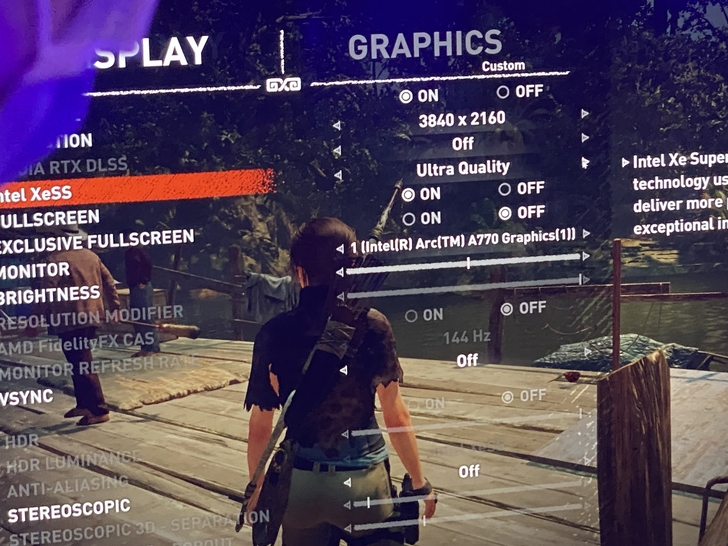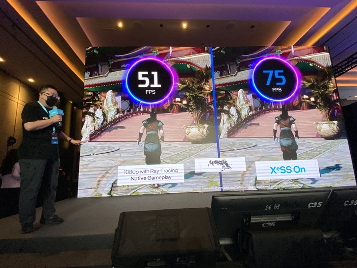 INTEL A380搭載了XeSS升頻技術 AI演算法,是以類神經網路為基礎的AI升頻技術,能夠輸入解析度較低的遊戲畫面,並經過深度學習運算後輸出高畫質影像,簡單地說就是玩家可以調低遊戲的畫質設定以換取更高的FPS效能表現,並透過升頻方式補強畫質體驗。FPS從51有感提升到75。