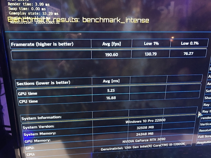 ▼第13代 Intel Core處理器的FPS測試數據為190FPS。