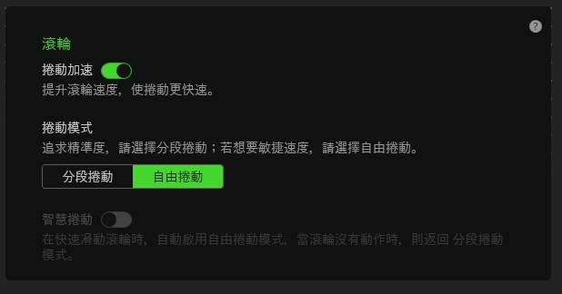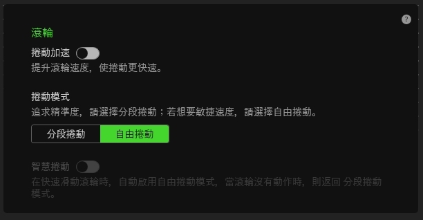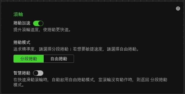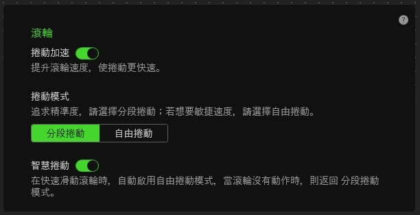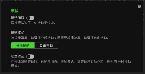 捲動模式 使用者可以自行按鍵切換,但是 捲動加速、智慧捲動 是要使用軟體才可以開啟的。