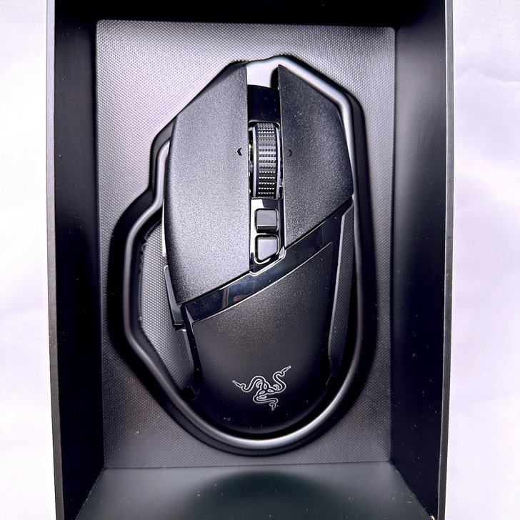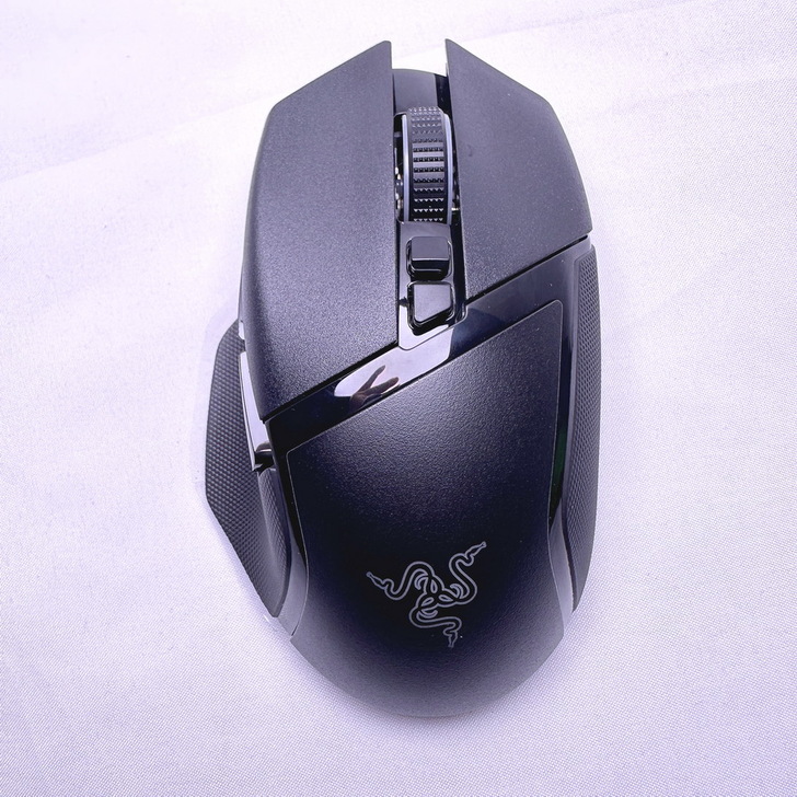 ▼ Razer Basilisk V3 Pro 從上方看可知整體為 黑色霧面 搭配 黑色鏡面條紋 設計,很巧妙的將滑鼠劃分為四個區域。