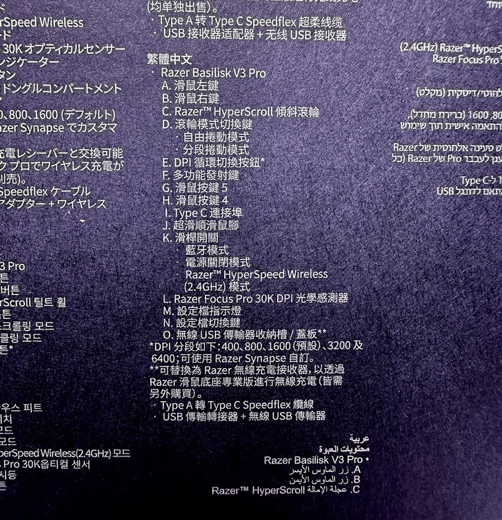 ▼ 多國語系說明書裡面夾了張雷蛇信仰貼紙,繁體中文這段一樣標註 Razer Basilisk V3 Pro 各功能鍵及特色。