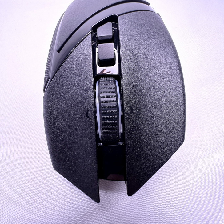 ▼ Basilisk V3 Pro 前方 可以看到造型獨特的滑鼠滾輪,上方兩個按鍵為 自由捲動或分段捲動切換鍵 以及 DPI切換鍵。