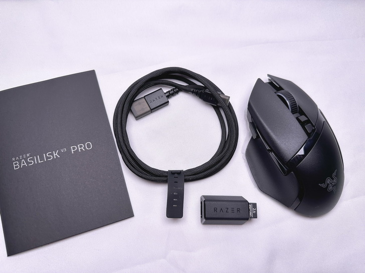 ▼ 內容物:說明書、Razer Speedflex Type-C 纜線、USB傳輸轉接器、2.4GHz HyperSpeed USB、Razer Basilisk V3 Pro本體。