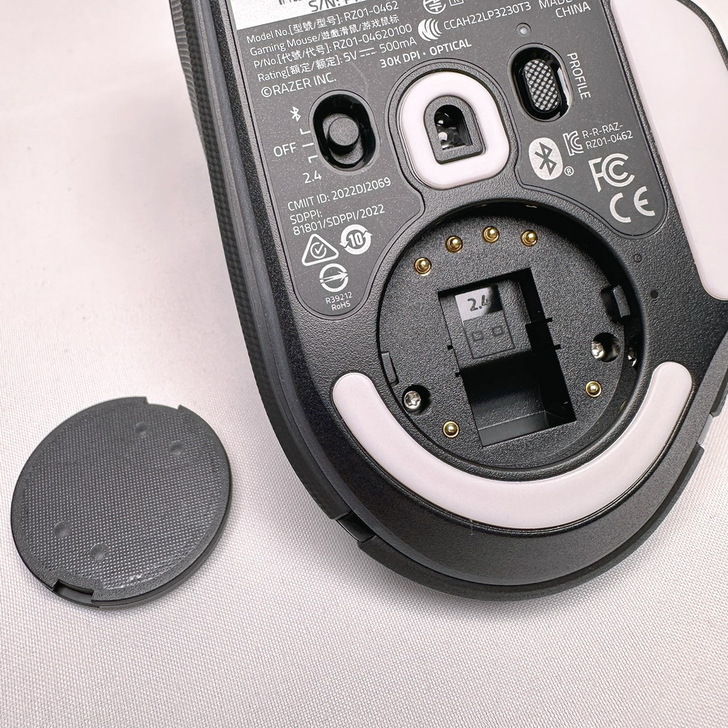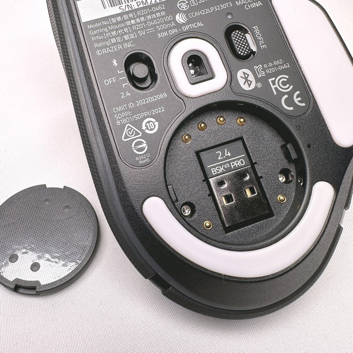 ▼ 打開底度外蓋可以看到 2.4G無線傳輸器 收納區,如果有購買 Razer無線充電接收器,則是直接把外蓋換掉就好。