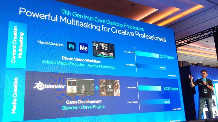 INTEL 13代Core產品比較12代在影像編輯軟體上提昇了27%,遊戲開發上則提昇了34%!