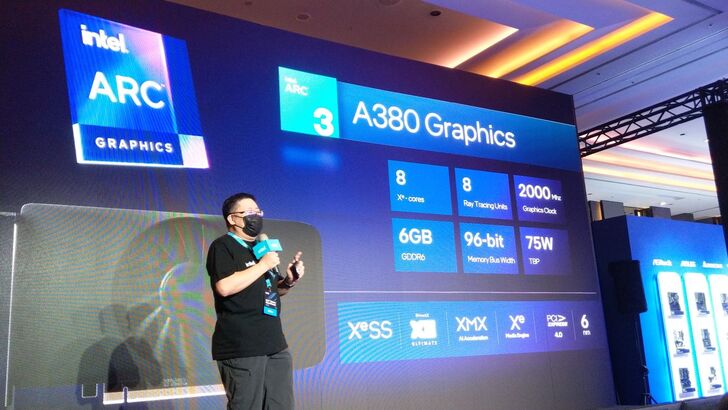 接著介紹INTEL ARC 日前發表的入門款顯示卡A380,擁有8個Xe影像處理核心,8個光追單元,核心速度2GHz,6GB GDDR6,記憶體頻寬96bit,75W功耗!