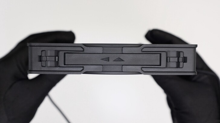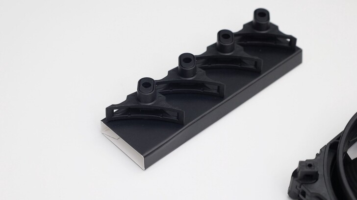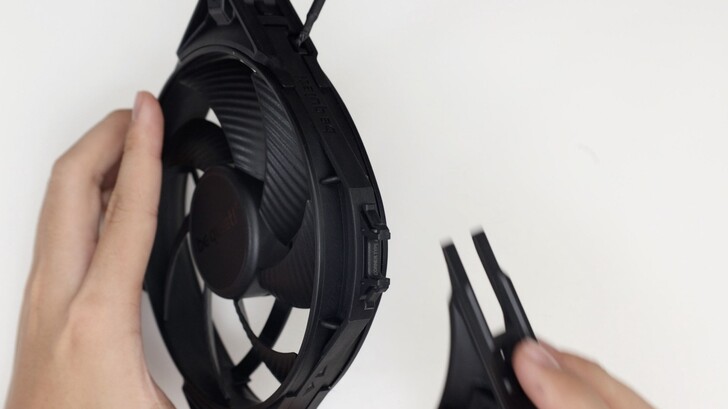 側邊有氣流方向和風扇方向的箭頭標示,這邊也可以看到其邊角設計有玄機。以製造的角度來說做得很好,風扇本體跟四個角落支架都是射出成型,分模線收得很好,細節邊緣不刮手,注料和頂針的位置都藏得很好,尺寸也相當精準。