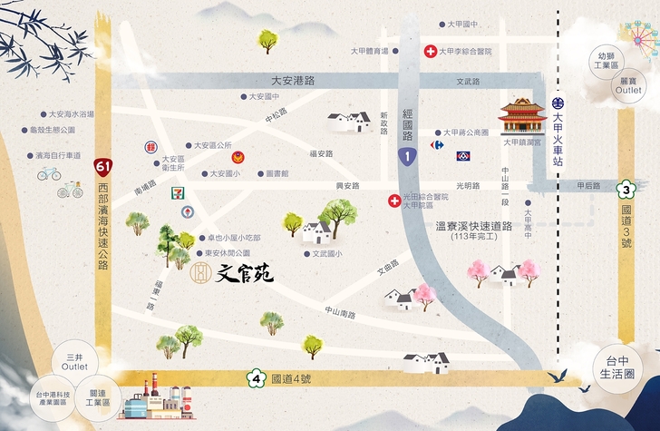 「十大文官苑」周遭鄰近大安圖書館、大安區農會、東安公園等公共建設,生活機能十分便利,更值得一提的是附近還有國道4號跟61西濱快速道路,通南往北十分方便且迅速,到台中市區只需40分鐘,而預計在113年完工的國道3號溫寮溪聯外道路更讓此地居民在交通上多了一條選擇。
