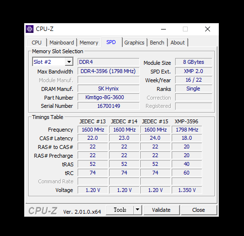 ▼ CPU-Z 驗明正身!採用Hynix顆粒,顯示其最高頻率為3600MHz,二條各8G的容量,合計16GB容量。