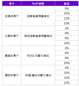 在4種果汁材料中選擇一種製作成果汁,就會套用Buff。每天提供1次免費的機會,