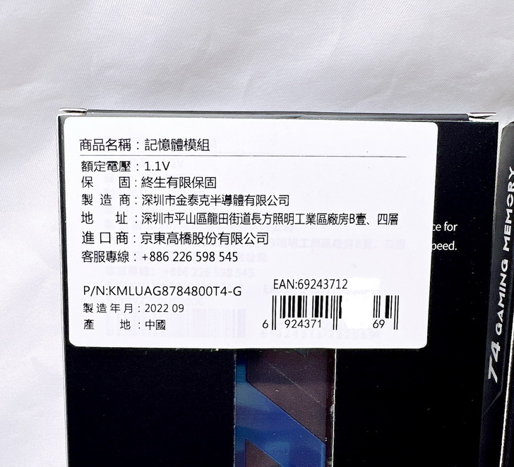 ▼ 盒裝背面 可以看到保固方面為 終生有限保固,台灣的客服專線(02)26598545;內容物為 T4 DDR5 16GB 4800MHz。